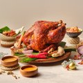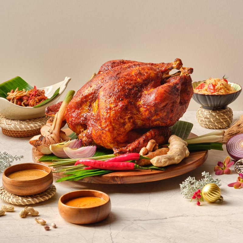 Spice up your celebration with our festive rendition of Ayam Percik, a beloved Malay classic. Brined for 24 hours in a traditional spice blend, the turkey is rubbed with a fragrant paste of ginger, candlenut, turmeric and aromatics, then slow-roasted to tender perfection.