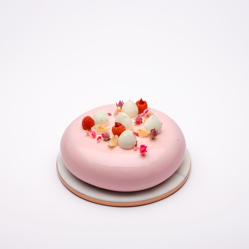 Beneath its beautiful exterior lies a sweetly scented combination of airy raspberry chiffon sponge, smooth lychee mousse and milky bandung rose gelee.