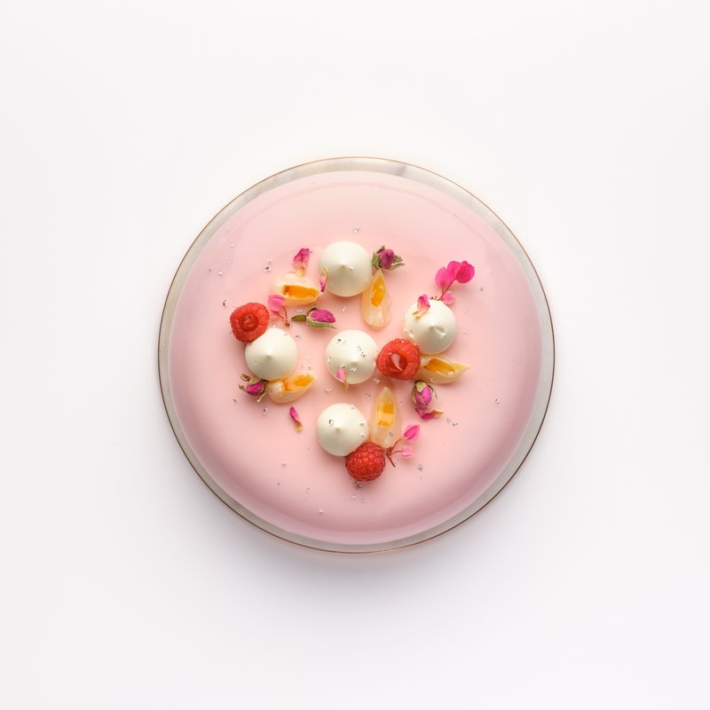 Raspberry Chiffon Sponge, Lychee Mousse, Bandung Rose Gelee